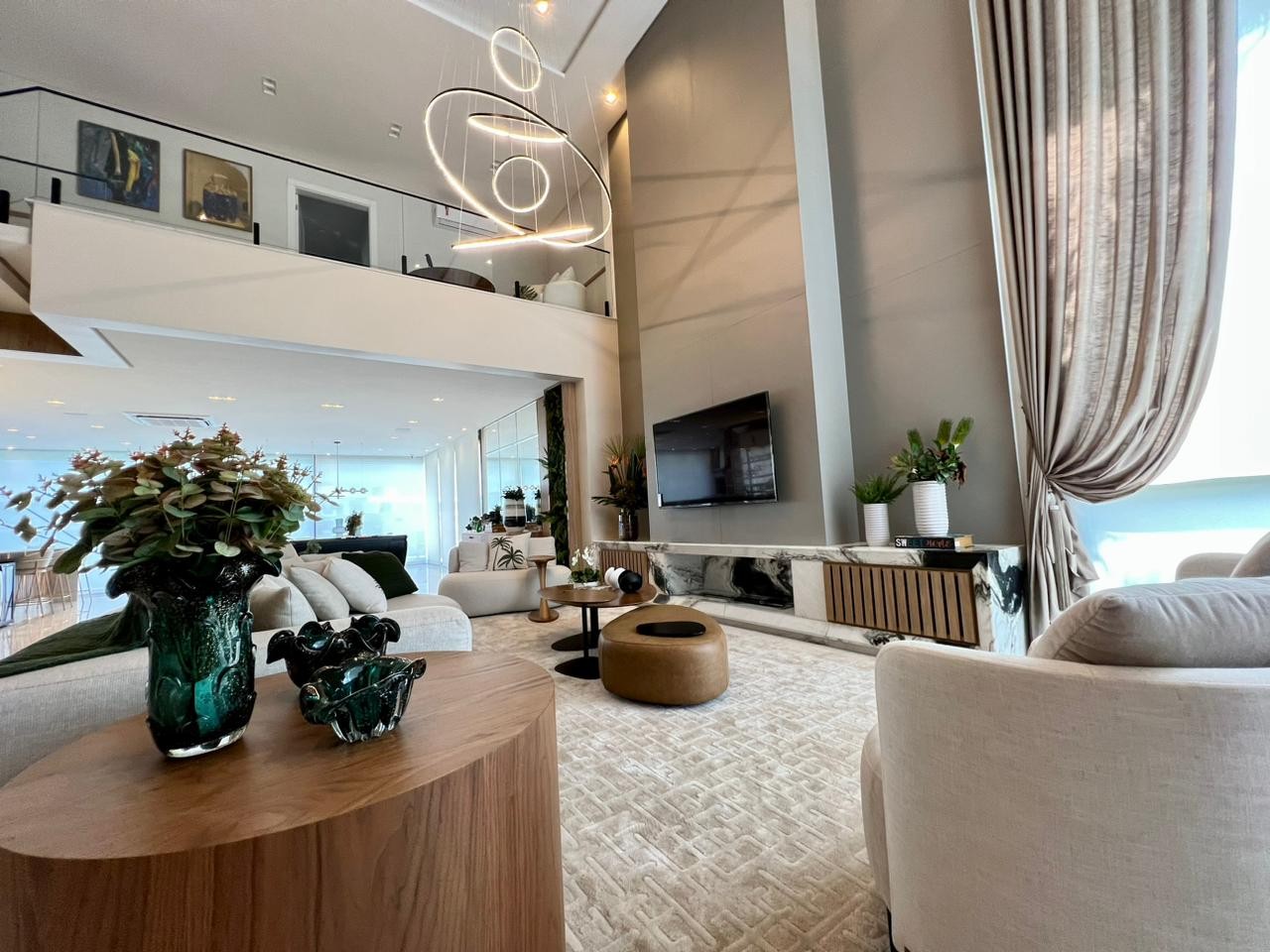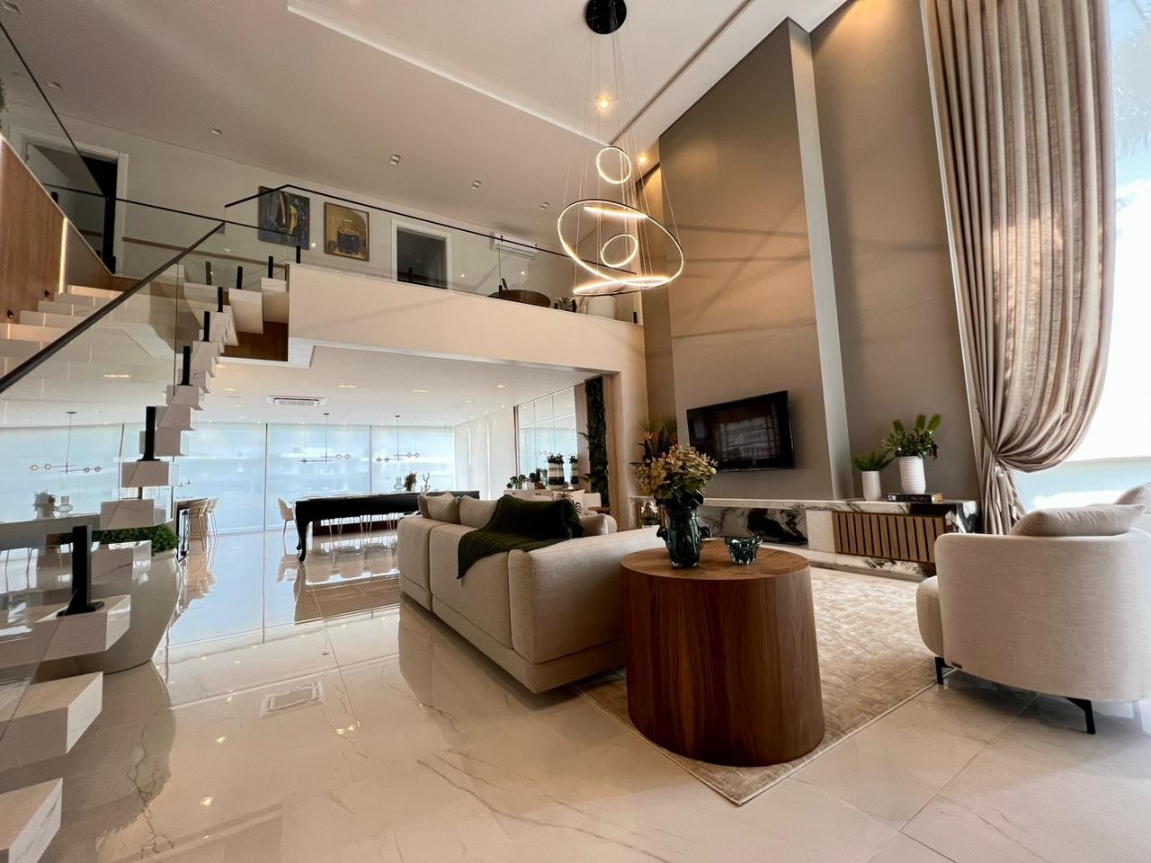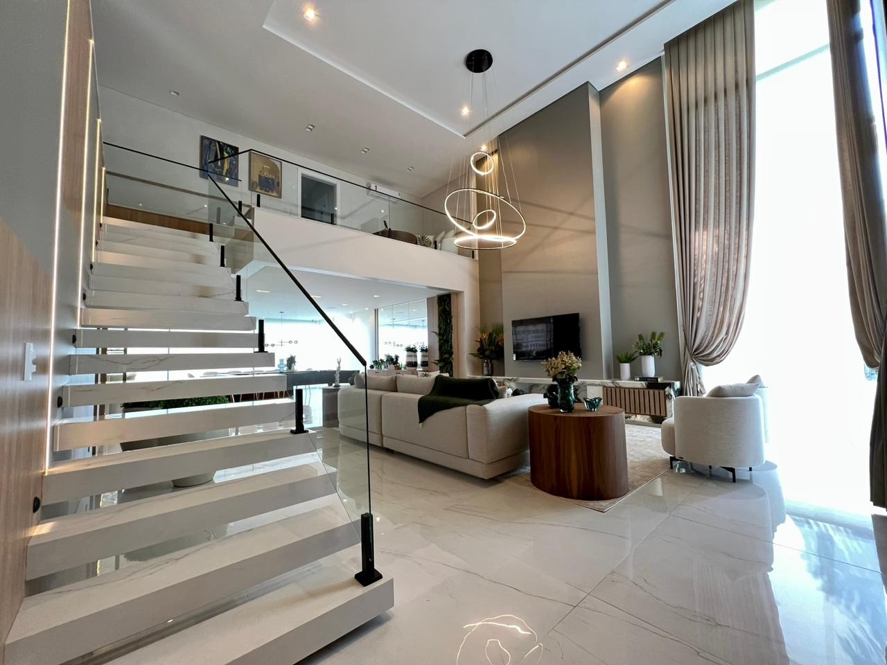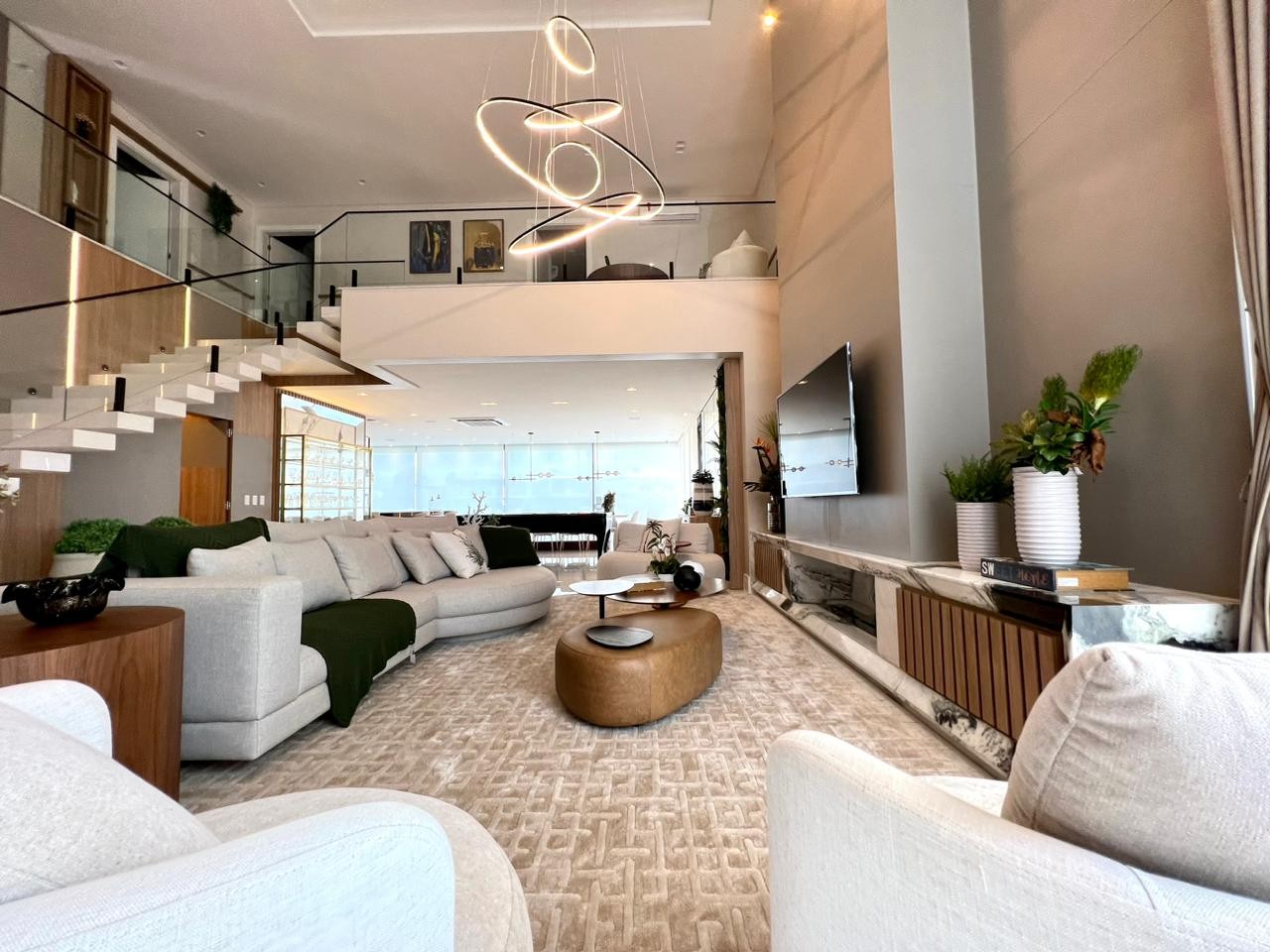 426m², 5 suítes (master e térrea), lavabo, sala de jantar, sala de estar, dependência de empregada, cinema, espaço kids ou home office, gourmet integrado a área de lazer piscina de concreto com borda infinita e cascata, espera para sistema fotovoltaico, jardim com irrigação automatizada, abrigo para 2 carros, espera para automação, depósito externo fechado, espera para elevador, posição solar e localização privilegiada. Mobiliada e decorada