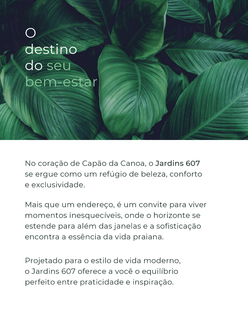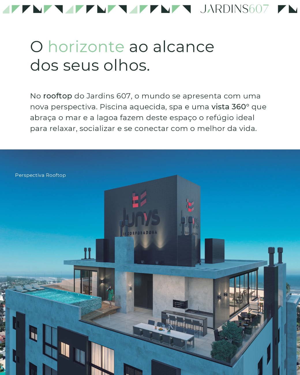 Jardins 607 – Junys em Capão da Canoa O Jardins 607 é um lançamento imobiliário em Capão da Canoa, no litoral norte do Rio Grande do Sul, que une modernidade, sofisticação e bem-estar. Este empreendimento de alto padrão conta com um rooftop exclusivo e infraestrutura completa, projetada para oferecer conforto e lazer para toda a família. Com acabamento de primeira linha e localização privilegiada junto ao mar, o Jardins 607 da Construtora Junys é a escolha ideal para quem busca qualidade de vida, segurança e praticidade no dia a dia. Viva em um condomínio planejado para proporcionar momentos únicos em uma das cidades mais valorizadas do litoral gaúcho. Descubra porque o Jardins 607 em Capão da Canoa é referência em estilo de vida e sofisticação no litoral norte.