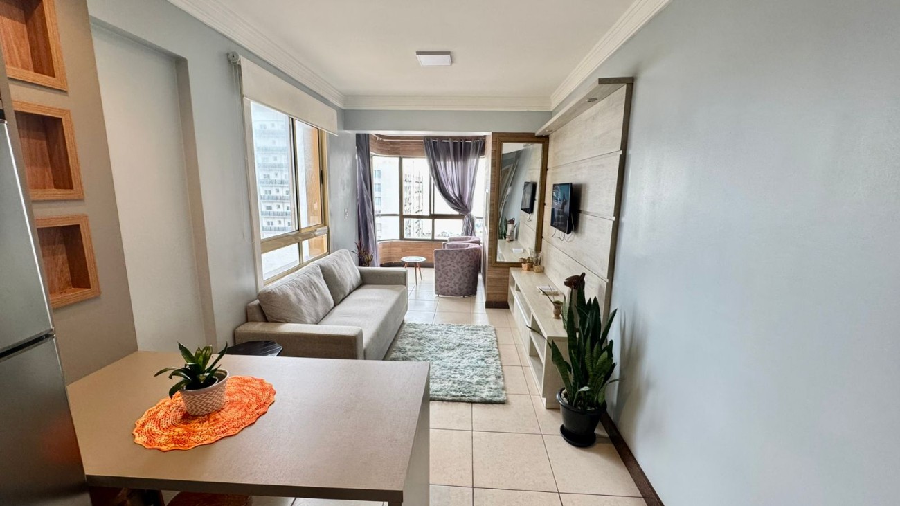 Amplo apartamento de 1 dormitório, banho social, living em 2 ambientes, sacada de frente com vista para o mar e praça, cozinha americana, lavanderia, apartamento mobiliado, Leste/Norte, box para carro. Edifício com hall decorado, elevador digital, portao e porteiro eletrônico, zeladoria permanente.
