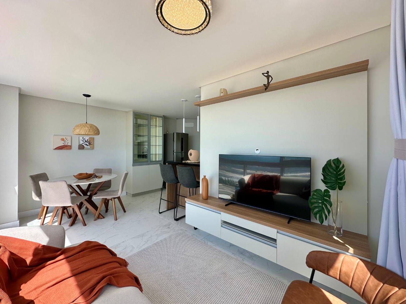 Lindo apartamento com vista para o mar de todas as peças, sendo mobiliado e decorado, dois dormitórios com suíte, banheiro social, Living Integrado, 91, 72 M² área, box de estacionamento, uma excelente oportunidade para quem busca comodidade e lazer pra toda família.