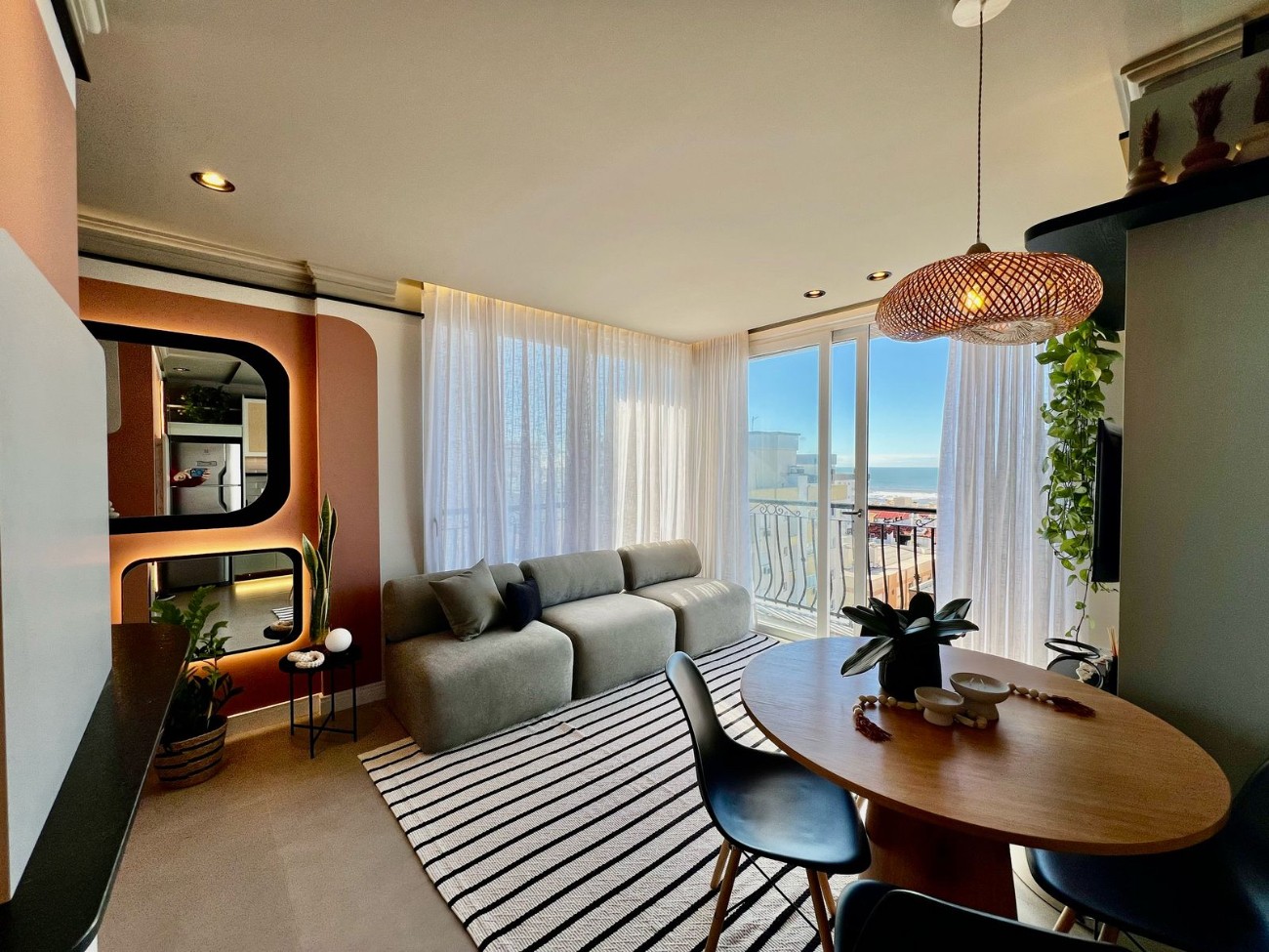 Apartamento em andar alto composto por 2 suítes, lavabo, living em 2 ambientes, sacada de frente aberta com vista para o mar, cozinha americana, lavanderia, apartamento mobiliado e decorado, box para carro. Edifício de alto padrão construtivo com hall de entrada decorado, elevador digital, piscina com borda infinita, salão de festas, portão e porteiro eletrônico, zeladoria permanente.
