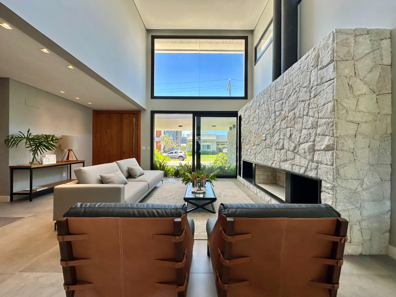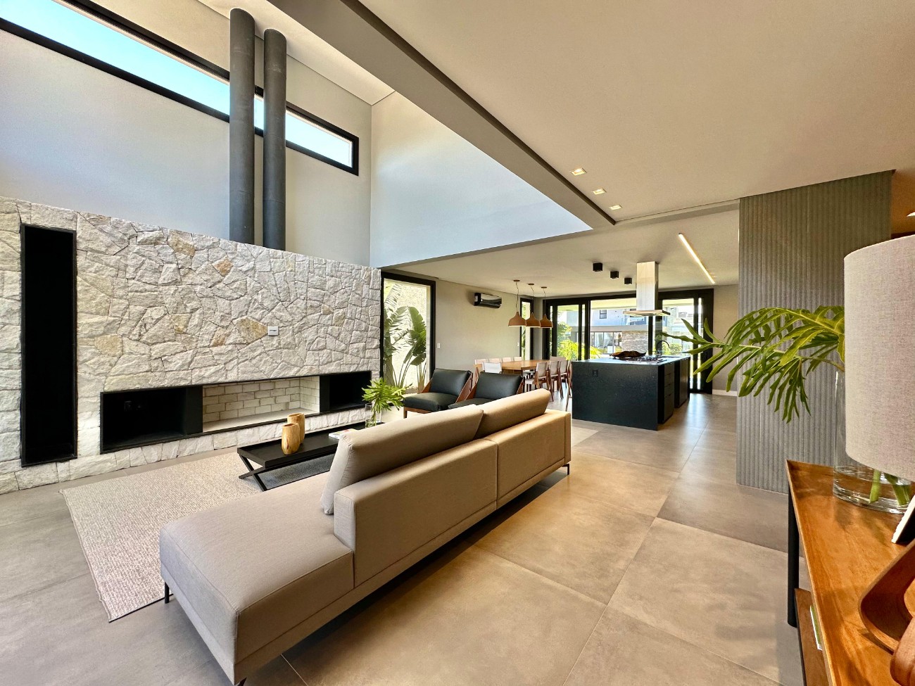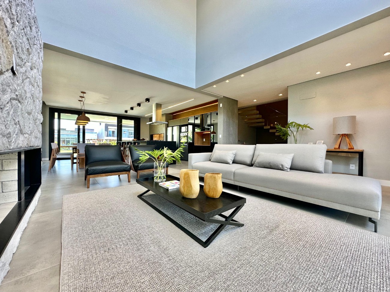Sobrado com 322 m², Lote com 343 m², Beira lago e vista permanente do pôr do Sol, 04 Suítes (uma Térrea), Lavabo, Lavanderia, Pátio de serviço e Depósito, Living integrado com 72 m², Piscina de concreto com espera para aquecimento solar/mecânico, Esquadrias em PVC e persianas automatizadas (Pedro Schwanck), Cozinha Gourmet Completa (Todeschini e Tramontina) Churrasqueira, Parrilla e Bifeteira, Banheiros completos com bancadas em Porcelanato (Portobello) e piso aquecido, Jardim com irrigação automatizada, Luminárias internas e externas, Esperas para instalação fotovoltaica, Mobília de alto padrão com móveis de designers conceituados, Climatização e aquecedores de água instalados.